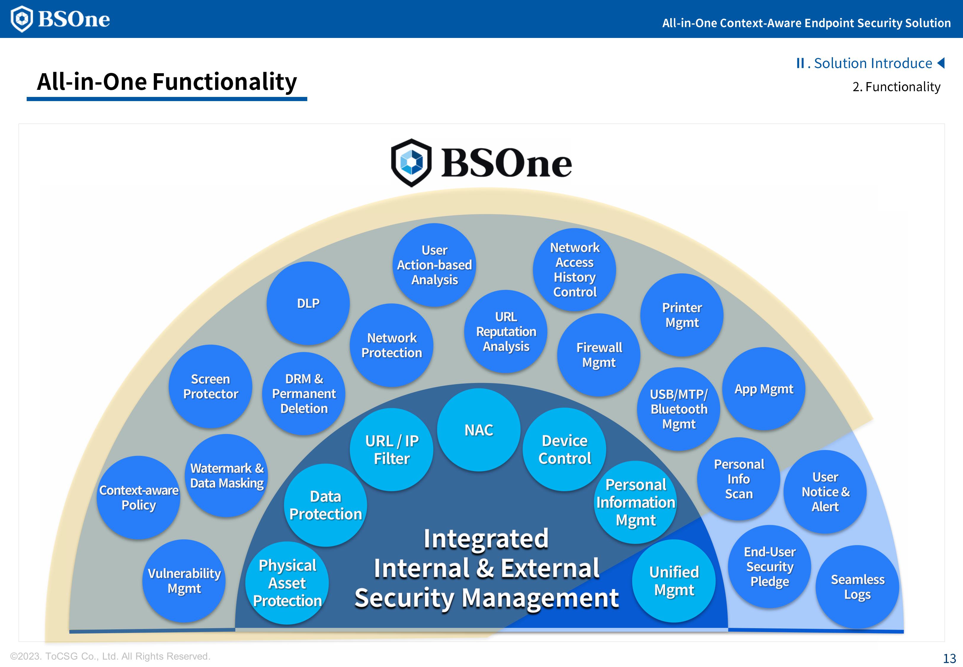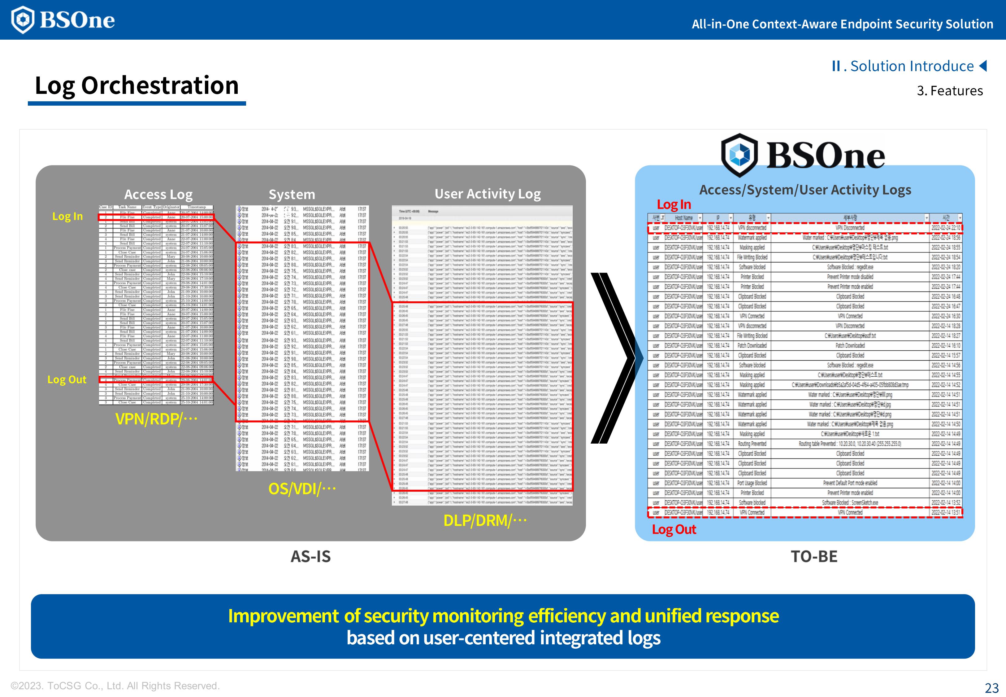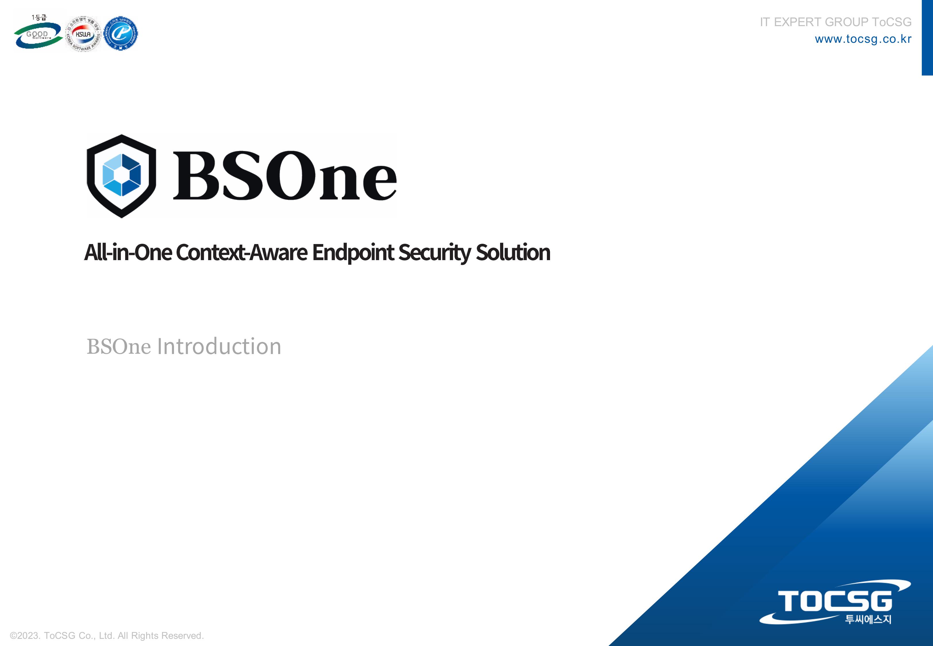 BSOne is an integrated PC security solution that provides various security features such as DLP, media control, and DRM with a single agent.