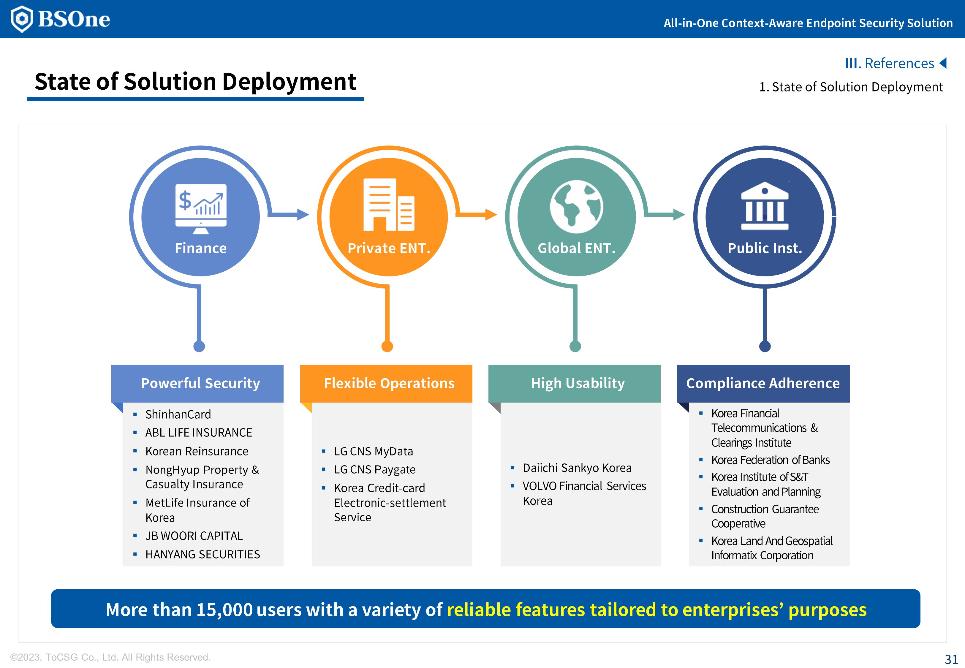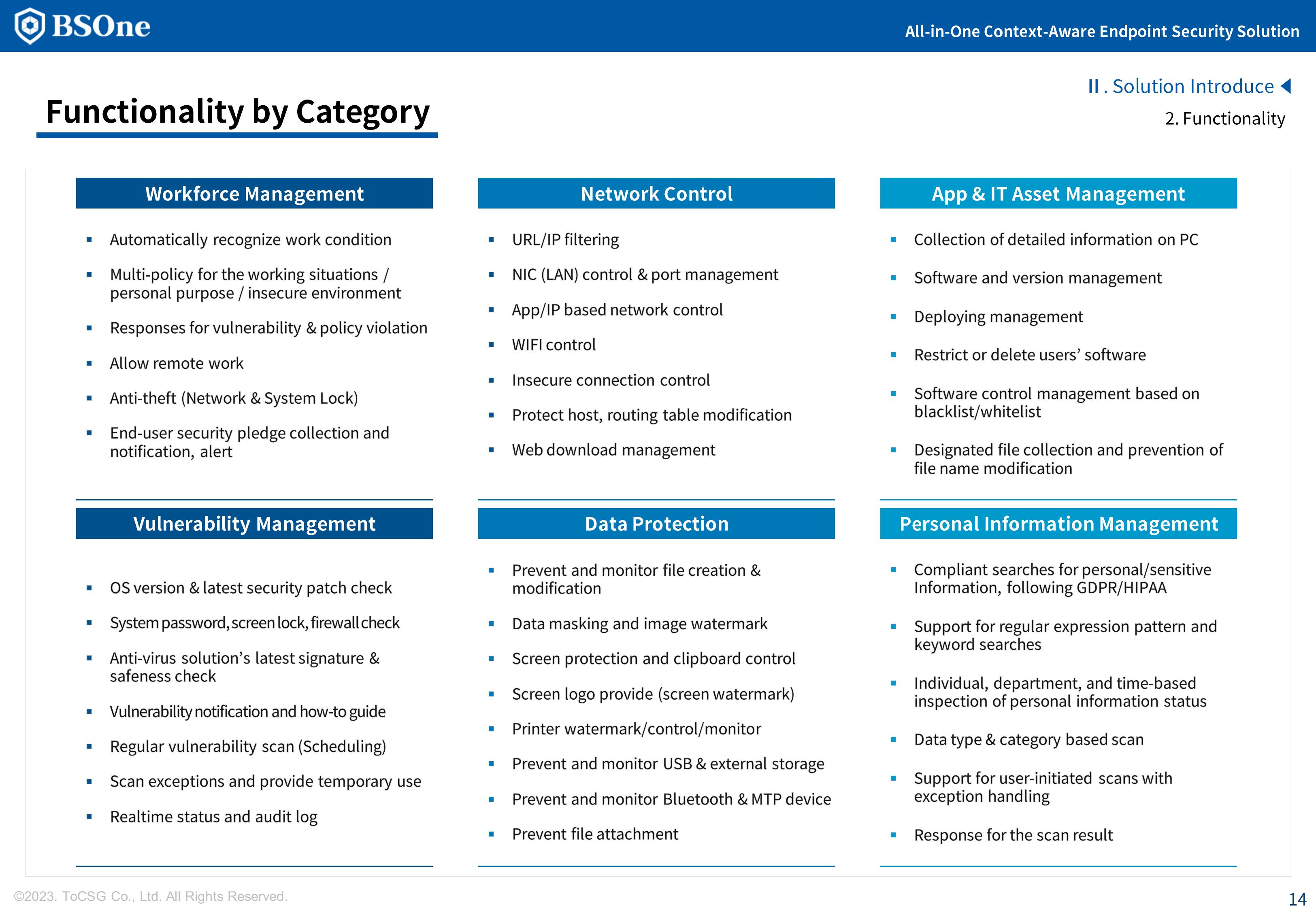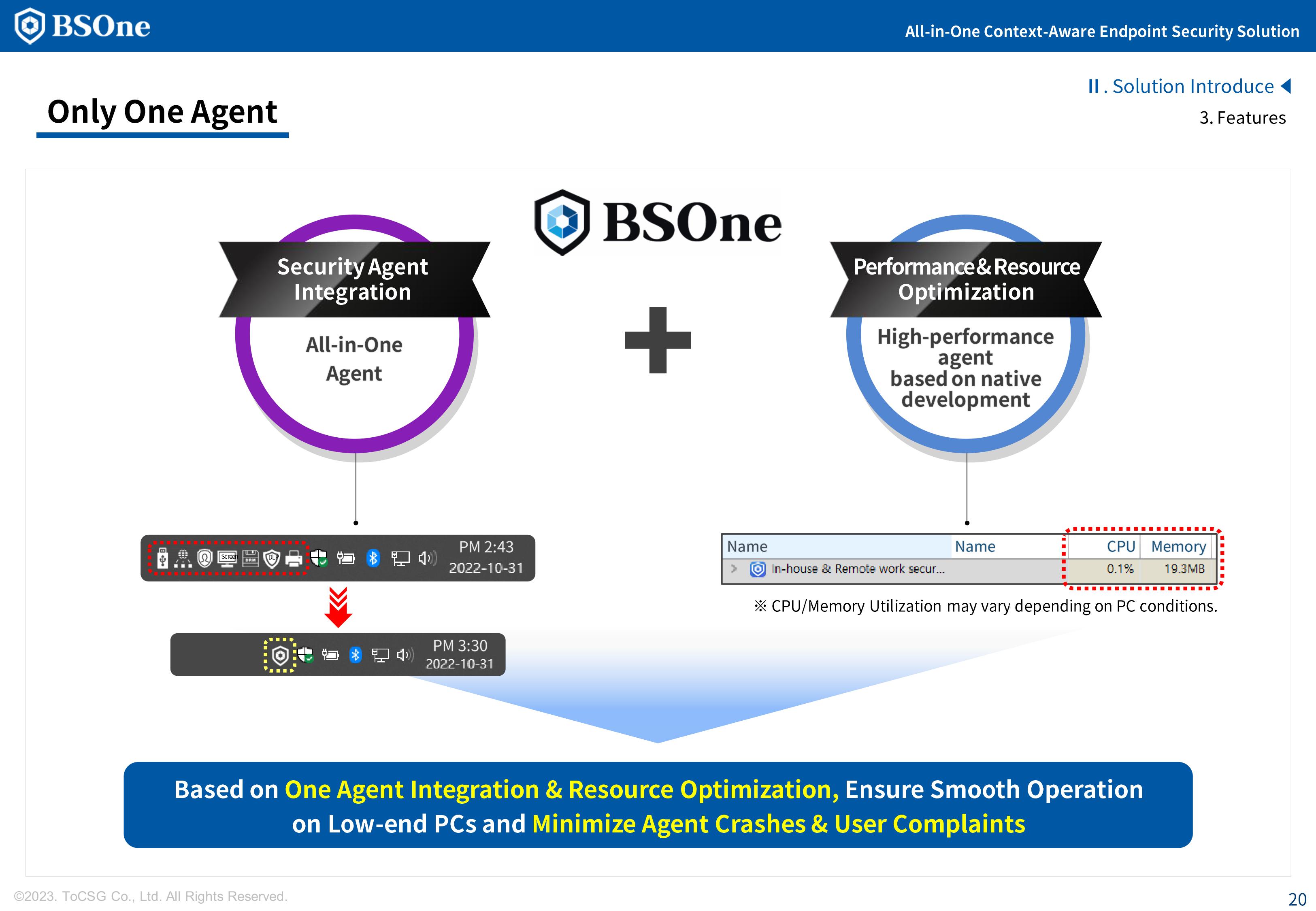 BSOne is an integrated PC security solution that provides various security features such as DLP, media control, and DRM with a single agent.